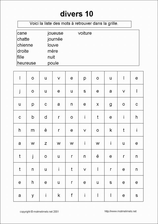 mots utilisés: fille mère louve chienne chatte cane poule heureuse joueuse droite voiture nuit journée |