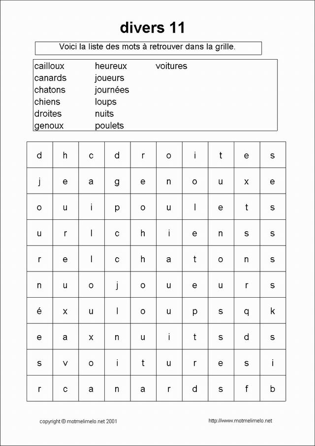 mots utilisés: genoux cailloux loups chiens chatons canards poulets heureux joueurs droites voitures nuits journées |