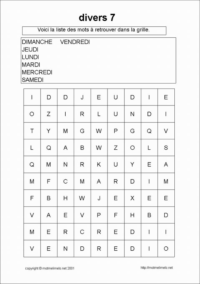 mots utilisés: LUNDI MARDI MERCREDI JEUDI VENDREDI SAMEDI DIMANCHE |