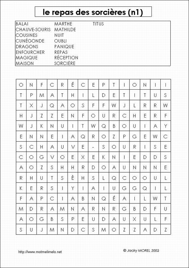 utilisés: REPAS SORCIÈRE OUBLI RÉCEPTION COUSINES MATHILDE MARTHE CUNÉGONDE DRAGONS TITUS BALAI ENFOURCHER MAGIQUE PANIQUE NUIT MAISON CHAUVE-SOURIS |