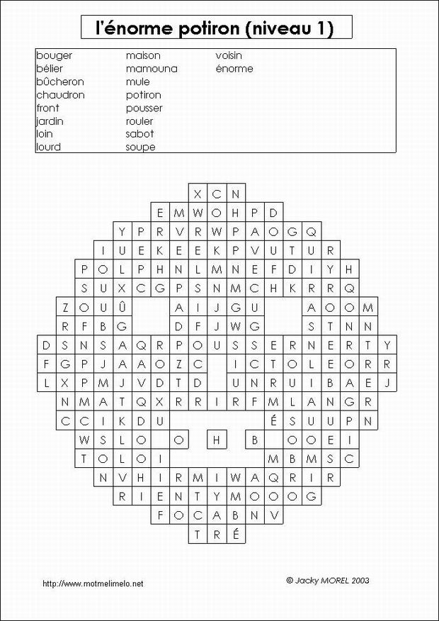 mots utilisés: énorme potiron mamouna chaudron soupe voisin bûcheron mule bélier pousser rouler bouger maison jardin lourd loin sabot front |