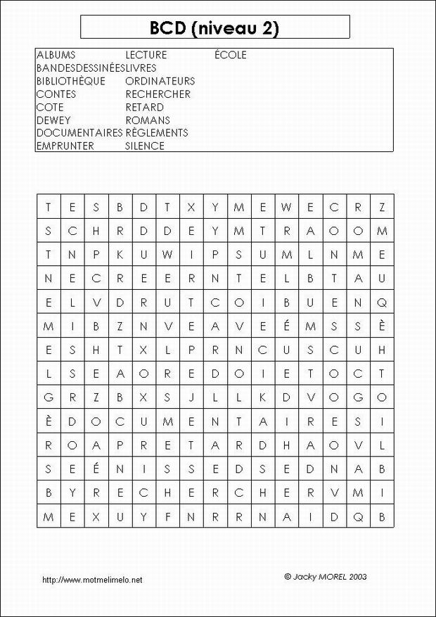 mots utilisés: BIBLIOTHÈQUE LIVRES COTE DEWEY DOCUMENTAIRES CONTES ROMANS ALBUMS BANDES DESSINÉES RÈGLEMENTS ÉCOLE EMPRUNTER RECHERCHER RETARD ORDINATEURS SILENCE LECTURE |