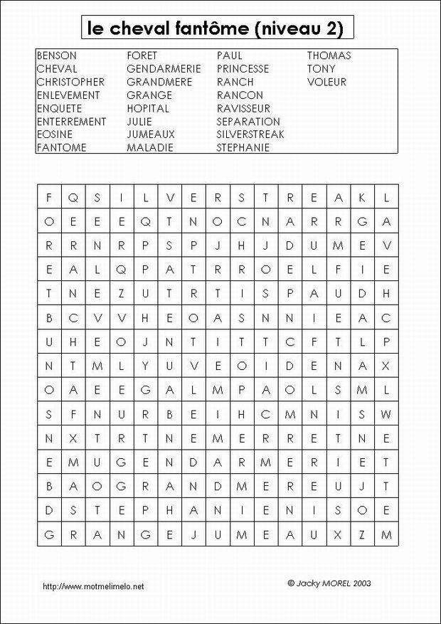 mots utilisés: VOLEUR JUMEAUX PRINCESSE CHEVAL ENLEVEMENT GRANDMERE CHRISTOPHER THOMAS JULIE RANCH EOSINE FANTOME SILVERSTREAK HOPITAL GENDARMERIE TONY GRANGE FORET MALADIE ENTERREMENT PAUL RANCON RAVISSEUR SEPARATION ENQUETE STEPHANIE BENSON |