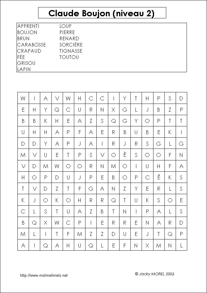 mots utilisés: BOUJON CRAPAUD TIGNASSE CARABOSSE FEE SORCIERE TOUTOU PIERRE BRUN GRISOU LAPIN RENARD LOUP APPRENTI |