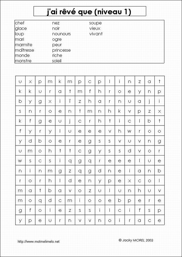 mots utilisés: nounours chef vieux vivant monde riche peur noir soleil ogre marmite loup princesse soupe monstre mari maîtresse glace nez |