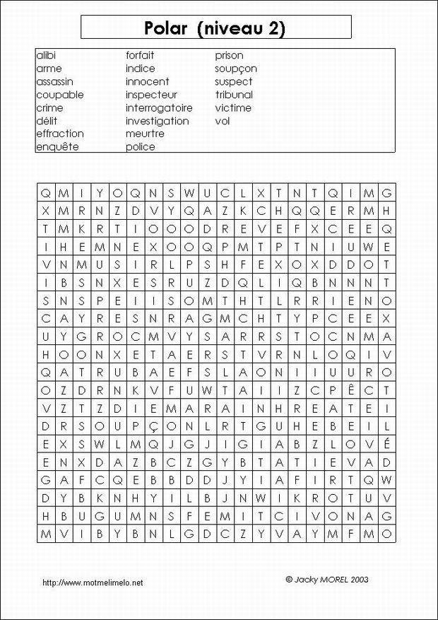 mots utilisés: coupable victime inspecteur meurtre vol délit forfait arme alibi indice crime enquête innocent soupçon tribunal prison investigation effraction police assassin suspect interrogatoire |