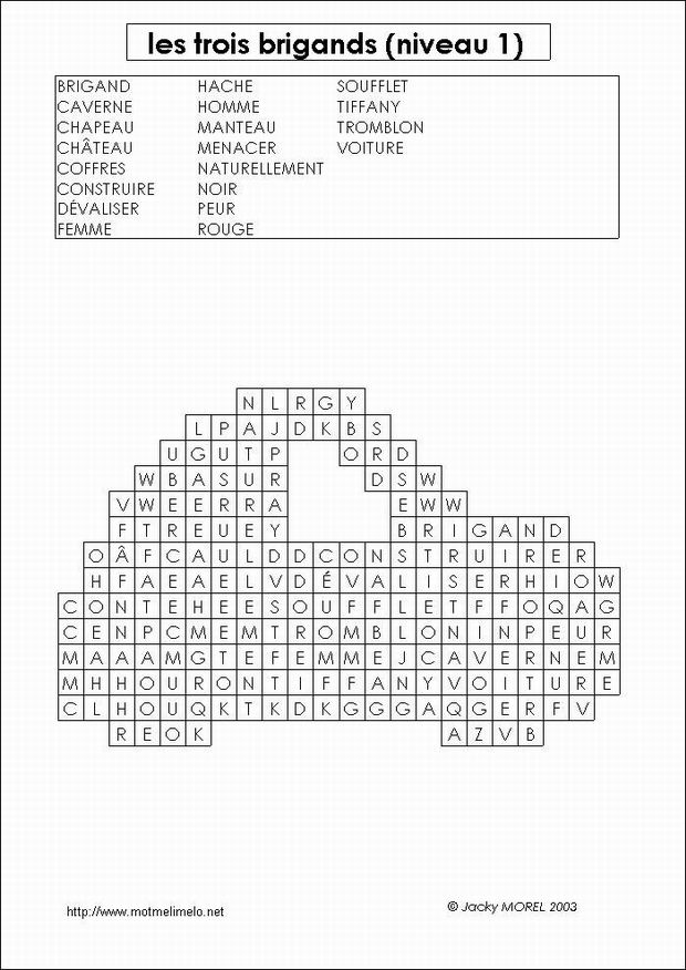 mots utilisés: BRIGAND TIFFANY TROMBLON SOUFFLET CHÂTEAU CHAPEAU MANTEAU CAVERNE COFFRES DÉVALISER MENACER NOIR ROUGE HACHE CONSTRUIRE VOITURE NATURELLEMENT HOMME FEMME PEUR |