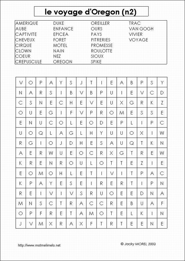 mots utilisés: VOYAGE OREGON DUKE SPIKE CLOWN CIRQUE NAIN TRAC ROULOTTE ENFANCE FORET EPICEA OURS AUBE CREPUSCULE COEUR AMERIQUE PAYS NEZ MOTEL SIOUX CHEVEUX VAN GOGH VIVIER PITRERIES OREILLER CAPTIVITE PROMESSE |