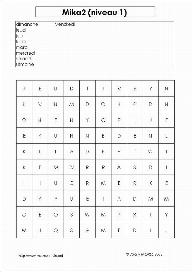 mots utilisés: jour semaine lundi mardi mercredi jeudi vendredi samedi dimanche |