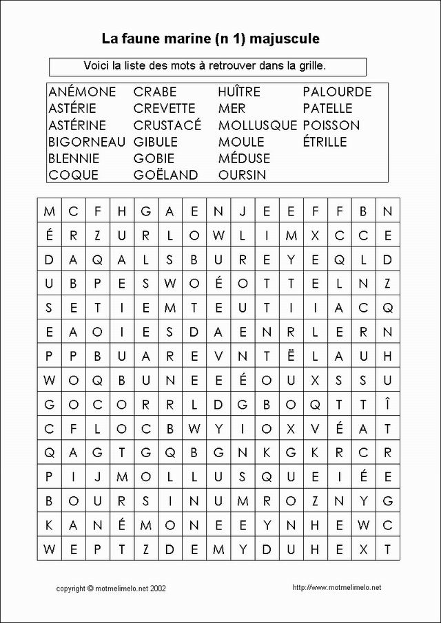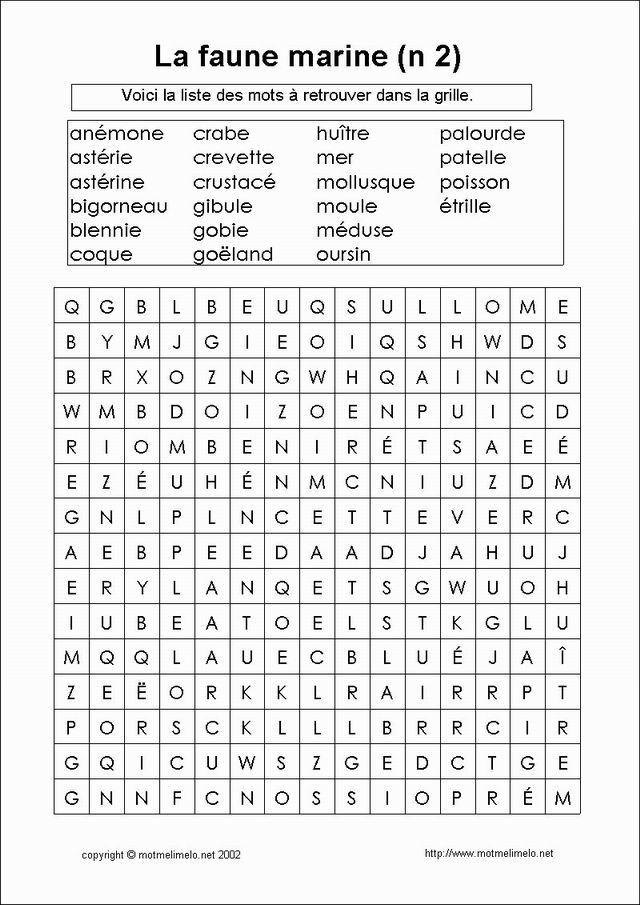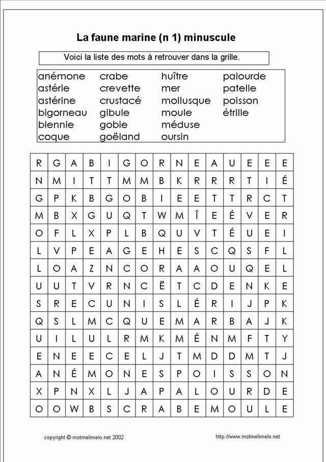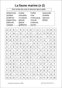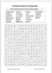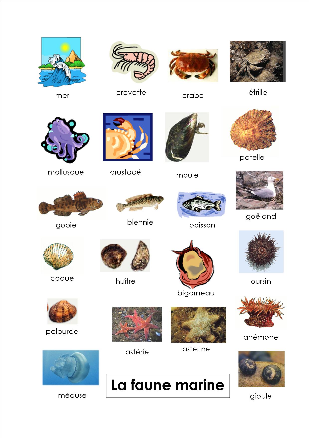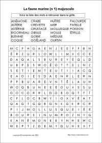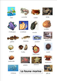 Mots utilisés: mer crevette goëland mollusque crustacé poisson crabe bigorneau étrille patelle gibule huître moule coque palourde gobie astérine oursin blennie anémone méduse astérie