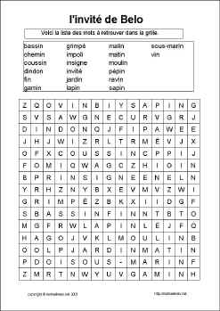 mots utilisés: bassin chemin coussin dindon fin gamin grimpé impoli insigne invité jardin lapin malin matin moulin pépin ravin sapin sous-marin vin