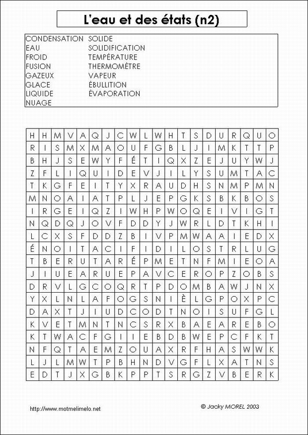 mots utilisés: LIQUIDE SOLIDE GAZEUX VAPEUR EAU FUSION SOLIDIFICATION ÉBULLITION ÉVAPORATION CONDENSATION GLACE NUAGE TEMPÉRATURE FROID THERMOMÈTRE |