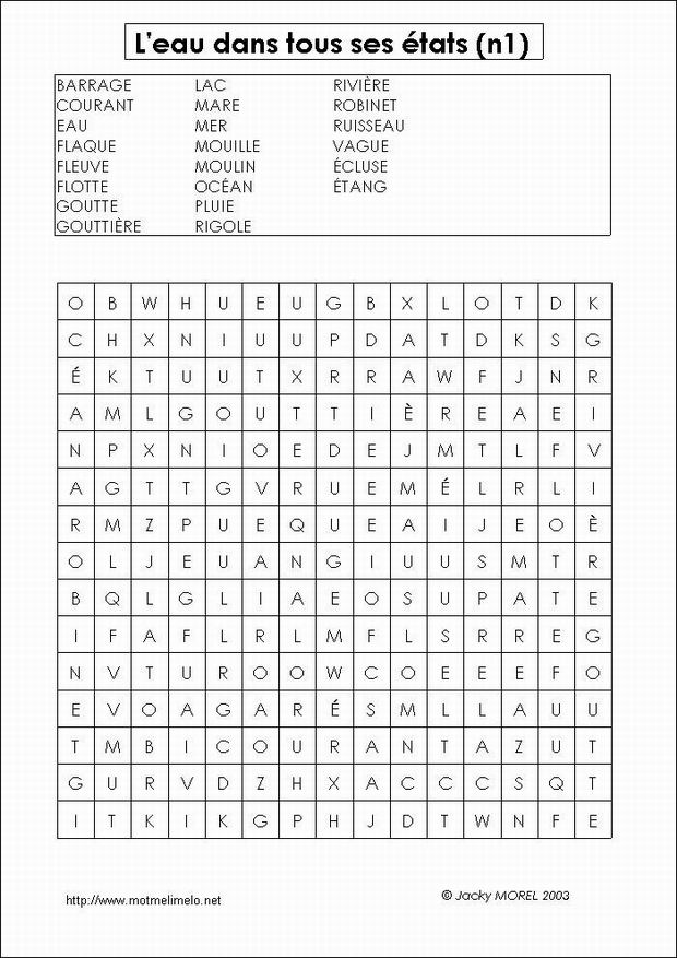 mots utilisés: EAU ÉCLUSE RIVIÈRE FLEUVE RUISSEAU GOUTTE MOULIN BARRAGE ROBINET FLOTTE FLAQUE MOUILLE PLUIE ÉTANG LAC MARE MER OCÉAN GOUTTIÈRE RIGOLE COURANT VAGUE |