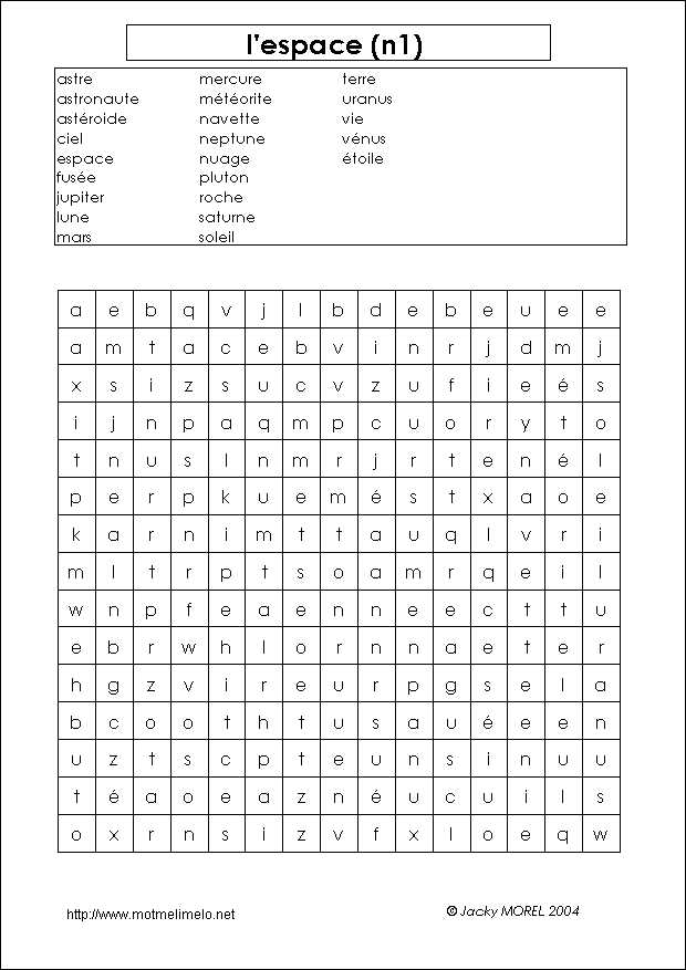 mots utilisés: espace ciel étoile lune soleil navette fusée astronaute astre astéroide météorite nuage vie roche mars vénus terre mercure jupiter saturne uranus neptune pluton |