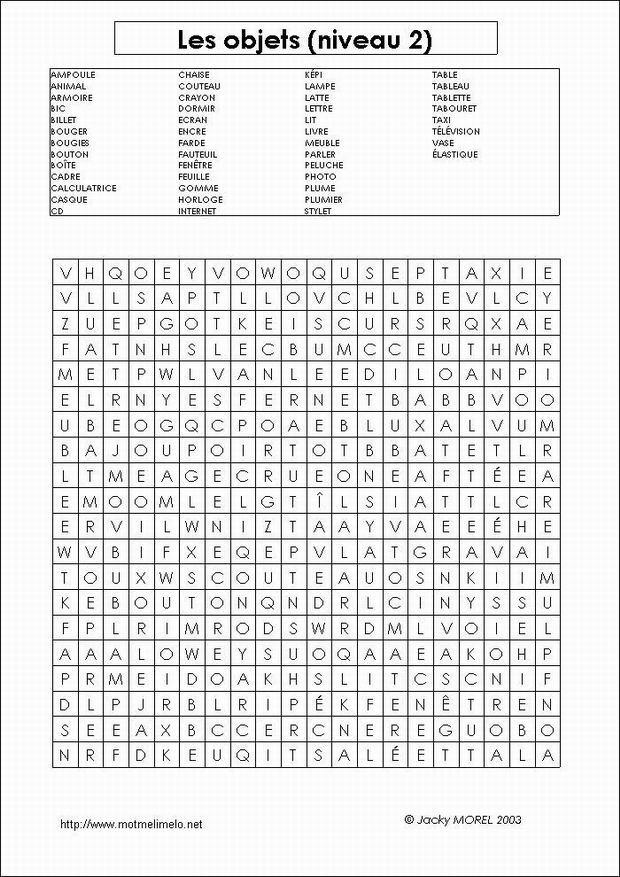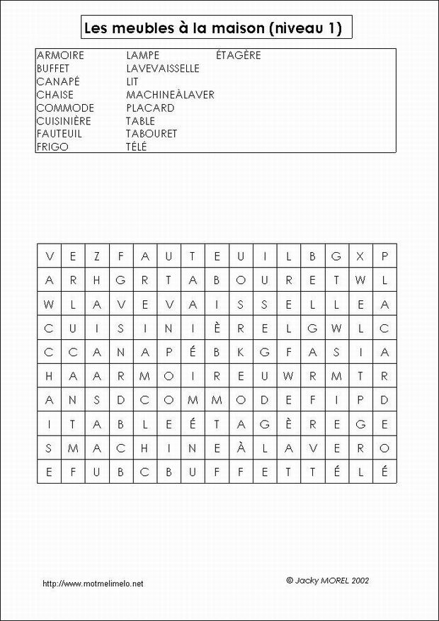 mots utilisés: ARMOIRE BUFFET CANAPÉ CHAISE COMMODE CUISINIÈRE ÉTAGÈRE FAUTEUIL FRIGO LAMPE LAVEVAISSELLE LIT MACHINEÁLAVER PLACARD TABLE TABOURET TÉLÉ |