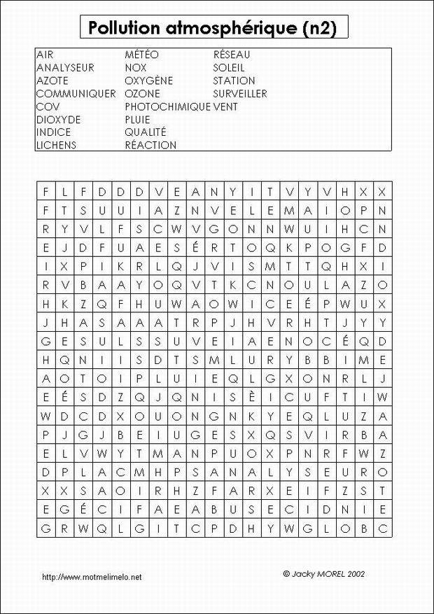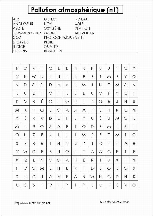 mots utilisés: AZOTE OXYGÈNE PHOTOCHIMIQUE RÉACTION INDICE SURVEILLER COMMUNIQUER STATION ANALYSEUR MÉTÉO PLUIE VENT SOLEIL DIOXYDE OZONE NOX COV LICHENS RÉSEAU AIR QUALITÉ |
