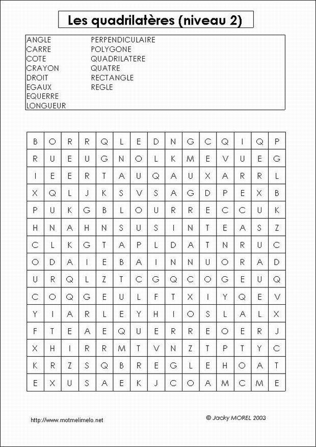 mots utilisés: QUADRILATERE CARRE RECTANGLE ANGLE DROIT COTE LONGUEUR EGAUX POLYGONE QUATRE PERPENDICULAIRE EQUERRE REGLE CRAYON |