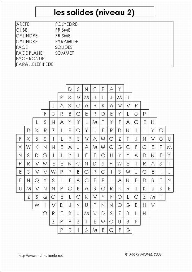 mots utilisés: SOLIDES PYRAMIDE CYLINDRE PRISME CUBE PRISME PARALLELEPIPEDE CYLINDRE SOMMET ARETE FACE POLYEDRE FACE PLANE FACE RONDE |